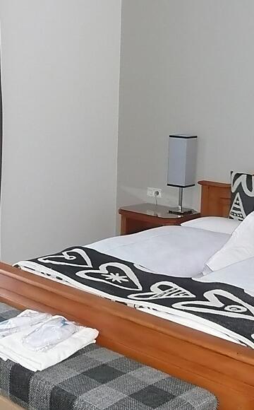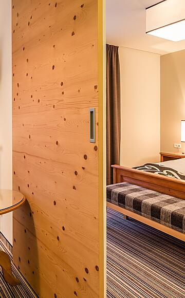 Doppelzimmer, welches mit einem kleineren 1-2-Bettzimmer durch Verbindungstür verbunden ist. Dieser Zimmertyp hat ein großes Badezimmer mit Dusche und WC, Bidet, großes Waschbecken und Föhn. Schreibtisch, Sat-TV (in beiden Räumen), Safe, Telefon und Balkon mit herrlichem Panoramablick.