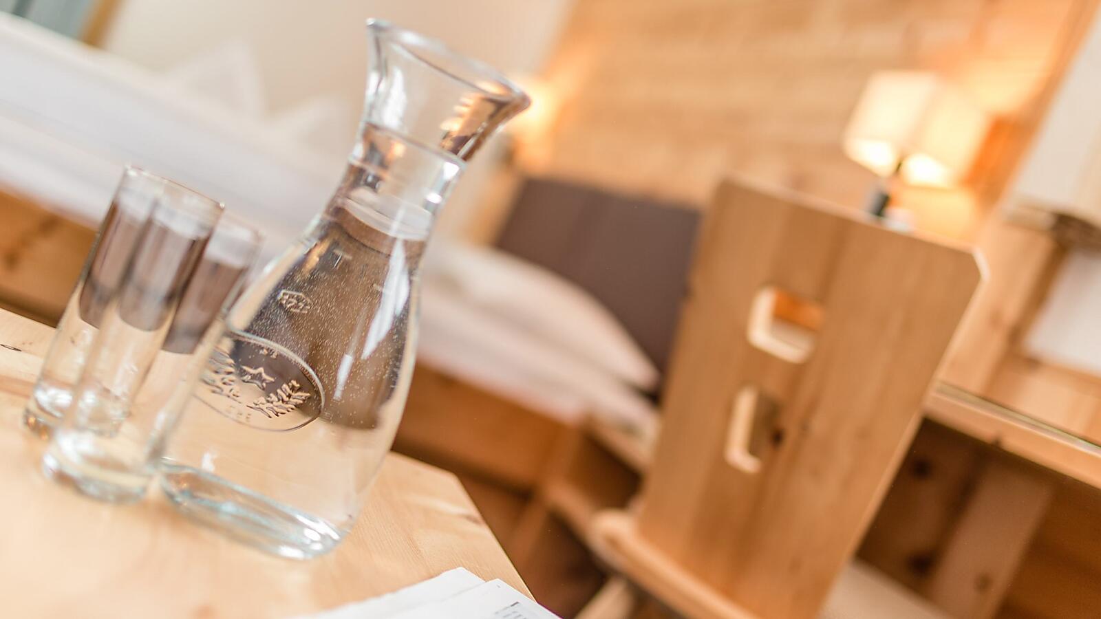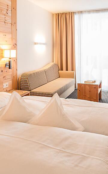 Großzügiges Doppelzimmer für 2-3 Personen, eingerichtet im schlichten modernen Stil aus natürlichem Zirbenholz, mit geräumiger Dusche und WC mit Föhn, Wohnecke, Schreibtisch, Safe, Telefon, Flat-TV mit Satellitenanschluss. Das Zimmer hat einen großen Balkon mit Gartenblick Ploseberg.