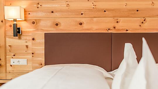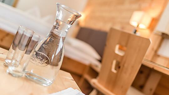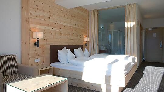 Spacious double room for 2 to 3 people, furnished in a simple modern style with natural Swiss pine, with spacious shower and WC with hairdryer, seating area, desk, safe,...