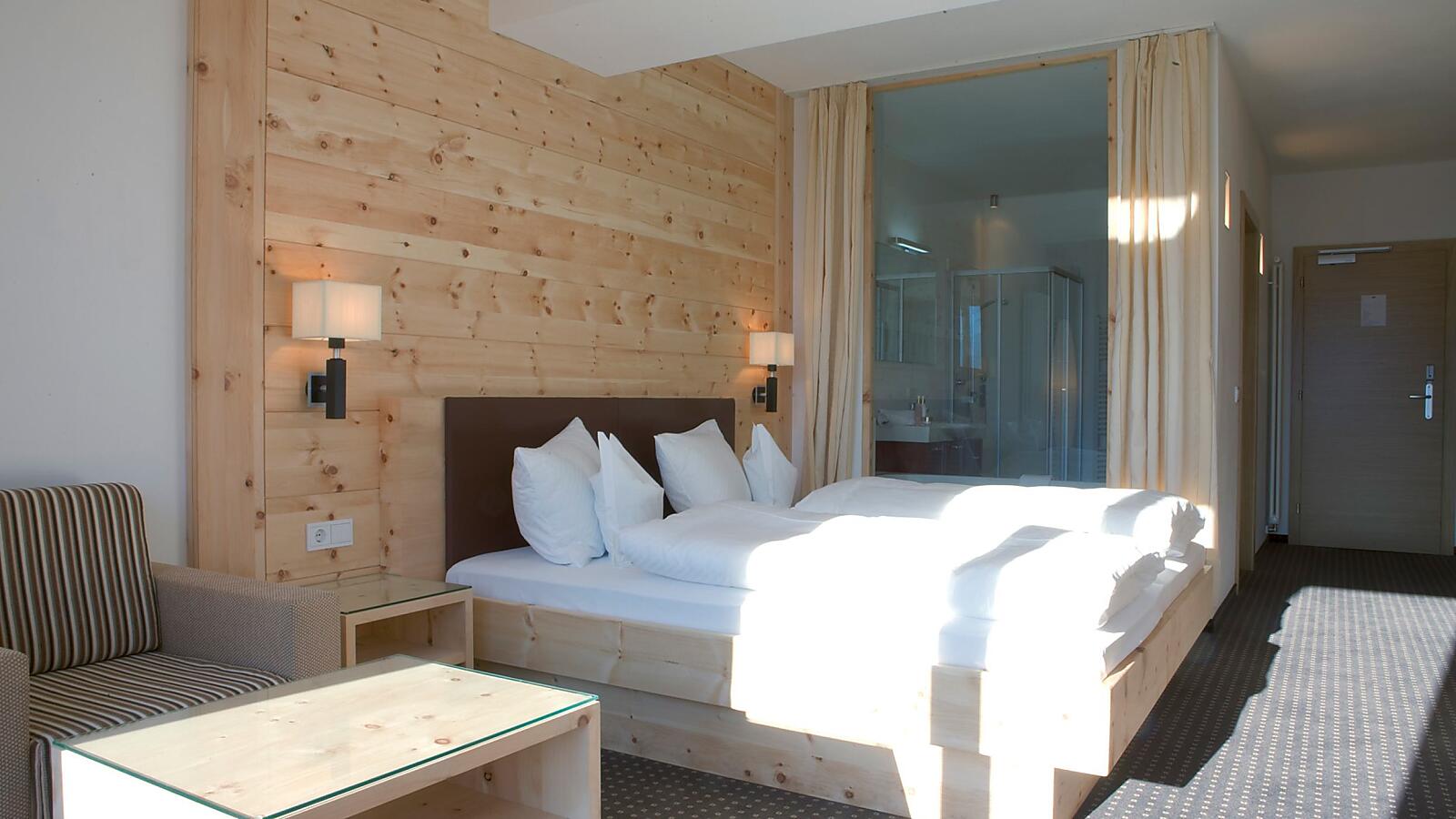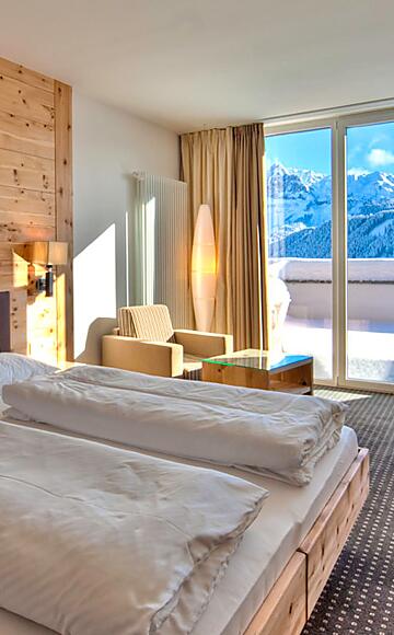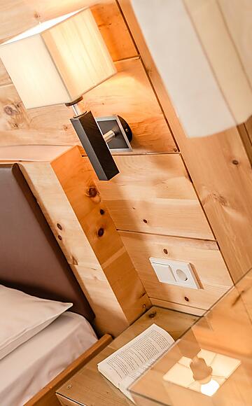 Spacious double room furnished in a simple modern style with natural Swiss pine, large bath, shower and WC with natural lighting. This room is equipped with hairdryer, comfortable seating area, desk, flat screen TV with satellite connection, safe, telephone and a terrace. It boasts a magnificent view of Odles peaks – Dolomites and is suitable for 2-4 people.
