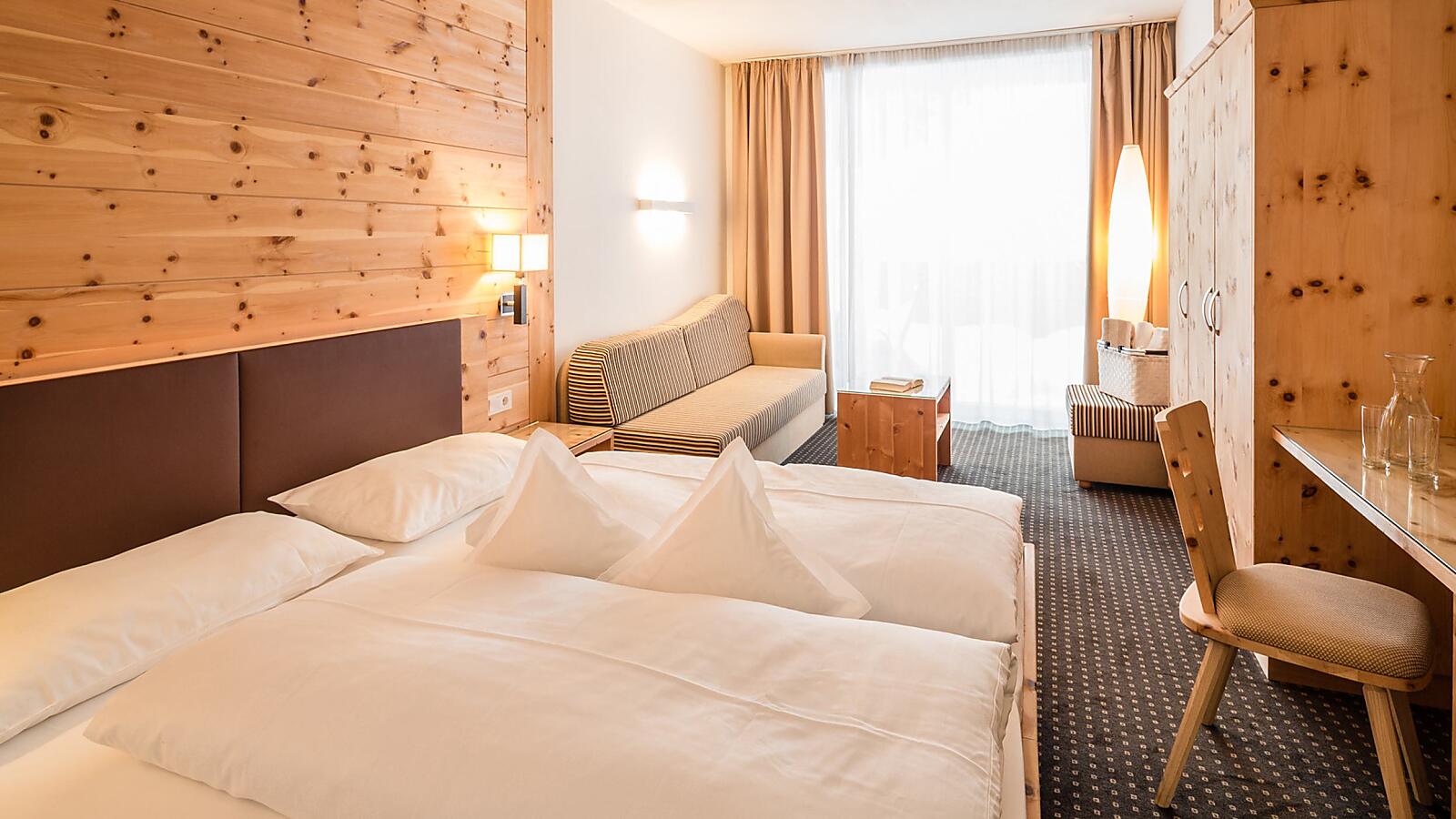 Spacious double room for 2 to 3 people, furnished in a simple modern style with natural Swiss pine, with spacious shower and WC with hairdryer, seating area, desk, safe, telephone, flat screen TV with satellite connection. The room has a large balcony with a view of the gardens and Plose mountain.